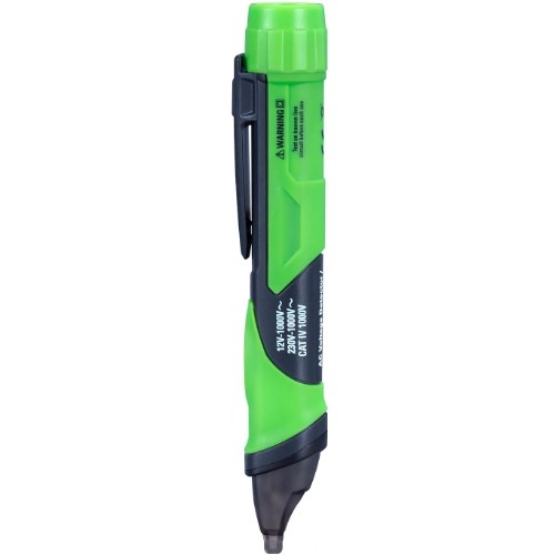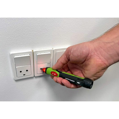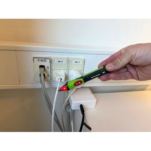 Spänning (fas) indikeras akustiskt (valfritt), med starkt rött ljus i spetsen samt med kraftig vibration för extra säkerhet.
