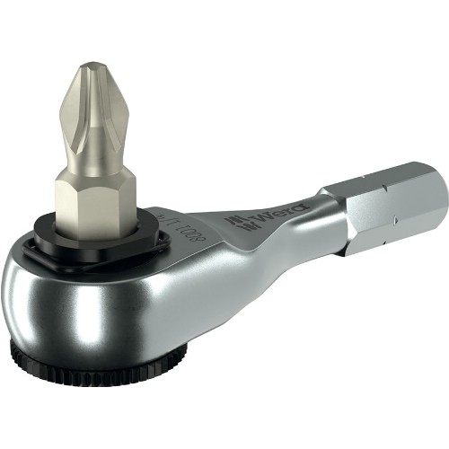 Bitsspärradapter där skruvbits med 1/4" sexkantsfattning monteras direkt i verktyget. Med 1/4" sexkantfäste för anslutning till bitsskruvmejsel. Sänksmitt helstålsutförande. Fintandad mekanism med 60 tänder och kort returvinkel på 6° för precist arbete. Räfflat hjul gör det möjligt att skruva snabbt i trånga utrymmen. Enkel vänster- och högeromkoppling.