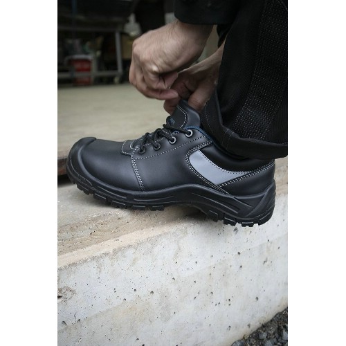 Skyddssko som kombinerar säkerhet med komfort. PU-belagt läder på utsidan med ett fukttransporterande textilfoder på insidan. Med tåhätta och spiktrampskydd av stål. Yttersula av PU-material för bra dämpning med ökad stabilitet. Passar bra för bygg och industri.