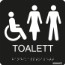 Skylt i hårdplast med 98% återvunnet material, med upphöjd punktskrift (taktil). Hög färgkontrast mellan bakgrund och text/punktskrift/symbol. Skylten är anpassad för utrymmen och lokaler där både seende och synskadade/synnedsatta vistas. Symbol för herr-, dam- och handikappanpassad toalett, text "toalett" samt punktskrift.